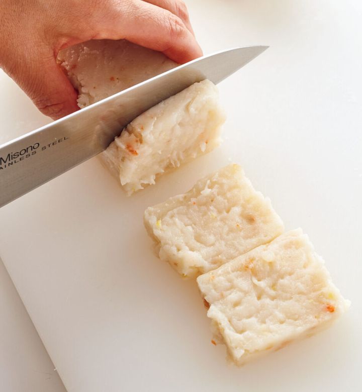 (5)流し缶から取り出して縦半分に切り、包丁を水でぬらしながら横に幅1.5cmに切る。ねぎの白い部分は縦半分に切ってしんを取り除き、斜めに細切りにして冷水にさらし、水けをきる。