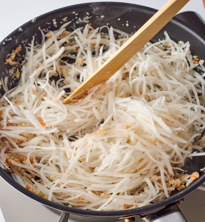 (2)フライパンにごま油大さじ2を中火で熱し、干しえびを入れて炒める。油が回ったらねぎ、しょうがを加えてさっと炒め、大根を加えてしんなりするまで炒める。