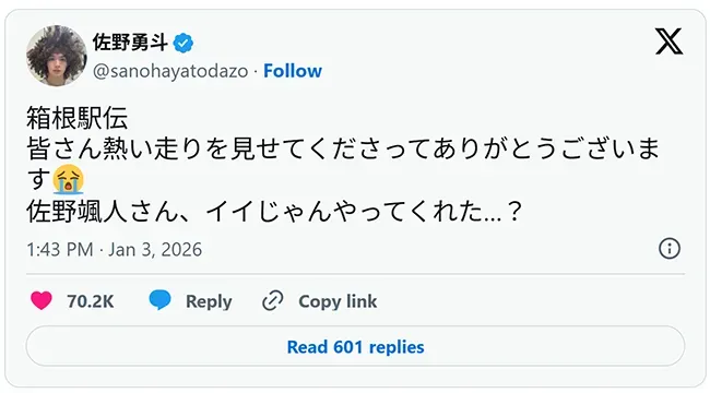 高橋英樹らが箱根駅伝を称賛 佐野勇斗は同姓選手の活躍に反応