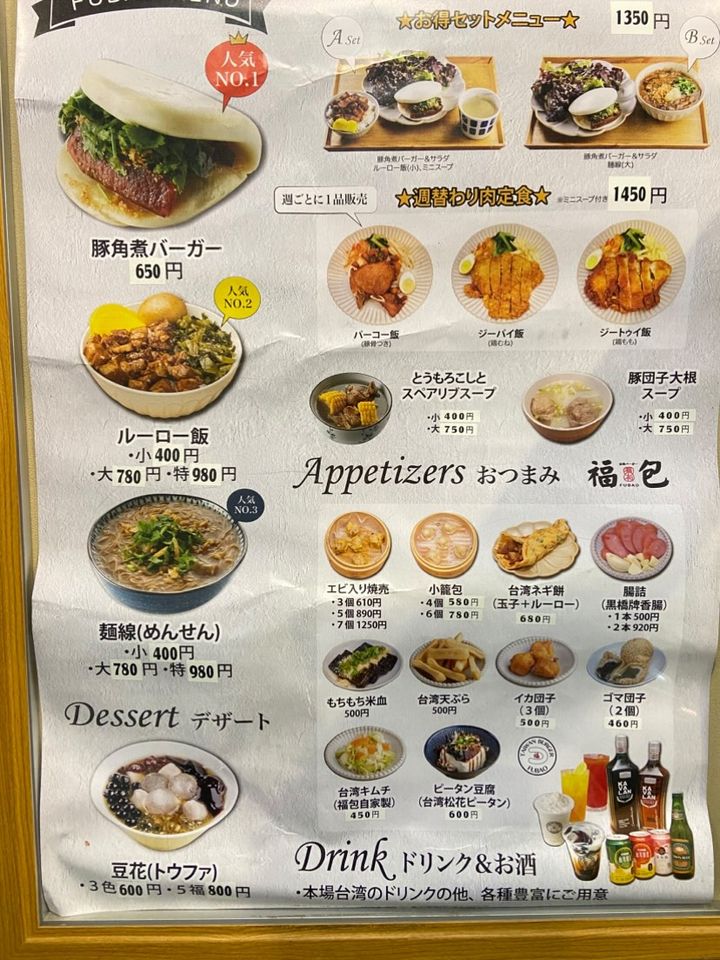 台湾バーガー 福包は、2019年8月にオープンしました。中野街にオープンして約6年人々から愛されている台湾料理店です。台湾出身の料理人によるローカル料理をいただくことができます。店内には、テーブル席とカウンター席があり、15人ほど入ることができます。女性ひとりでも入りやすい雰囲気のお店でした。気になるメニューですが、魯肉飯・小籠包・豚角煮バーガーなどの馴染みあるメニューから、台湾のローカルメニューまで、種類が豊富でした。ご飯や麺系のメニューは、小・大・特大から量を選ぶことができるのも嬉しいですね。本場台湾のドリンクも飲むことができますよ。