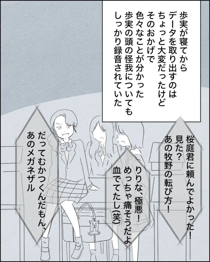 歩実が寝てから2人でデータを取り出すのは少し大変でしたが、ボイスレコーダーのおかげで色々なことが分かりました。歩実が知らない間に、教室内で話す風間さんの声もしっかり録音されていて、球技大会の時に歩の頭にボールが当たる事故の真実が分かったのです。