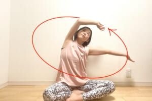 両腕で円を描くようにゆっくりと体を左へ大きく回します。