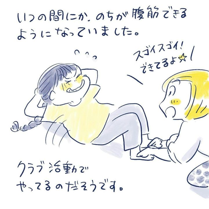 イラストレーター原あいみ(@aimihara)さんの娘は、部活動でやっている腹筋を自宅でもしていました。娘の足をおさえてサポートしていた原あいみさん、次は自分もやってみることに。すると、腹筋中に娘が「あること」をしてくれて…。