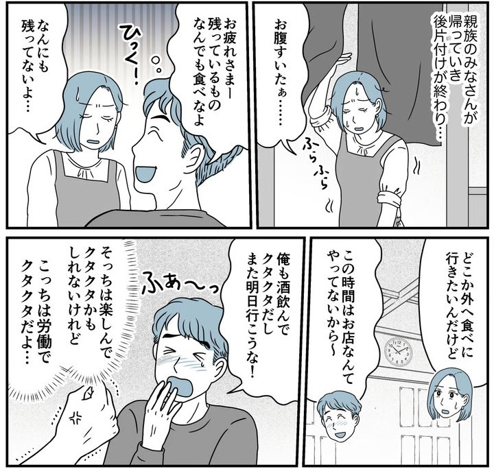 『お邪魔してるから何かお手伝いするのはいいですよ。マナーとして。だからって他親族は飲み食いしてるのに嫁だけずっと皿洗いって……。旦那も何も言わない。準備を手伝っていて「お客さんきたら、ご飯食べられないから」と言って、手で1枚ローストビーフを掴んで義母に渡された。私は犬かいな。よく嫁は家族だから気遣いせずもてなさないっていうけど、これ家族以下だよね?』出典:https://mamastar.jp/bbs/topic/4508372