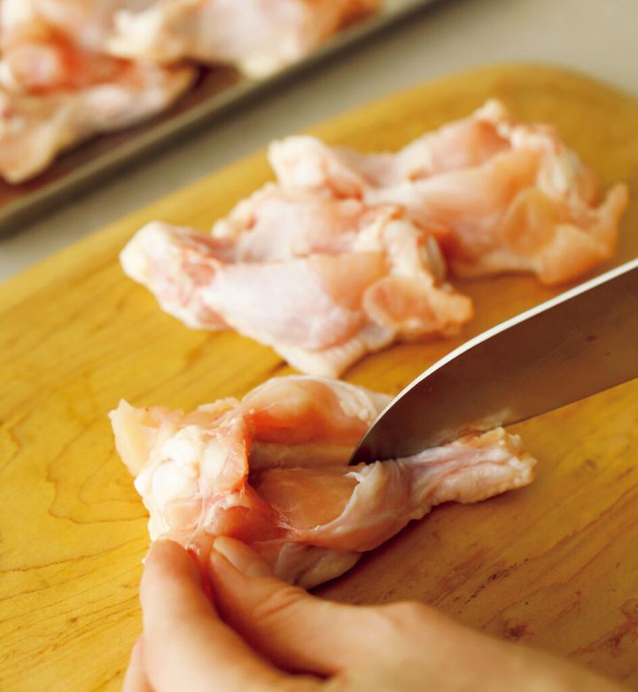 ねぎは縦半分に切り、斜め薄切りにする。にんにくは縦半分に切る。手羽元は包丁の刃先で骨の両側に切り込みを入れる。