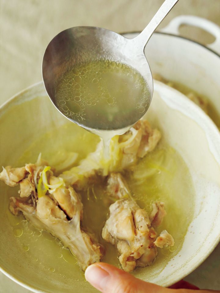 煮るほどにほろほろになる手羽元も、このスープのごちそう。澄んだスープと一緒に、最後までじっくり楽しんでください。