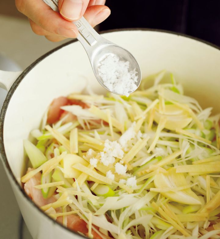 材料を鍋に入れて煮るだけ。使う調味料は塩だけなのに、手羽元のうまみと香味野菜の力で、驚くほど奥行きのある味わいに仕上がります。