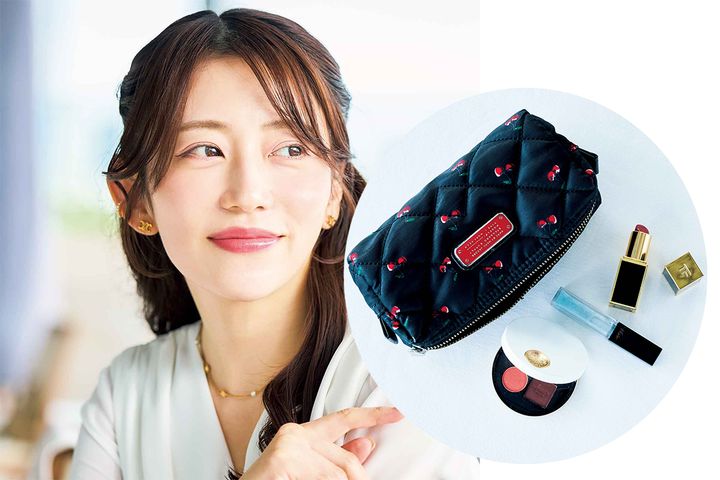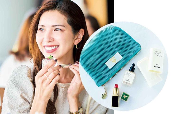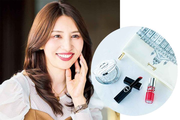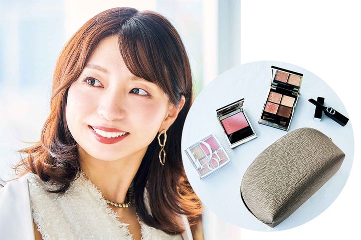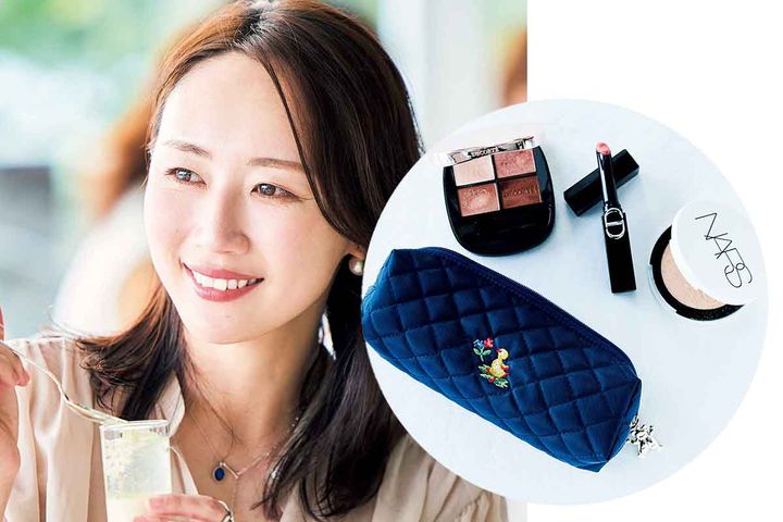 話に夢中になりメイク直しに行くのを忘れがちな女子会では、色もちのいいディオールリップが欠かせない存在。ツヤも大切だからディオールのハイライト004やSUQQUのチーク07、SUQQUのアイシャドウ14を頰や額、瞼に重ねてキラッとした輝きをプラス。必要最低限だけボナベンチュラのポーチに入れています。