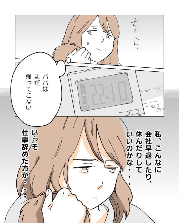 かわいそうに。しんどくて泣き止まなかった翔が疲れてウトウトした時にはもう夜10時を回っていましたが、まだ夫良平は帰ってきません。翔を抱きしめたまま、私はこんなに頻繁に会社を早退したり休んだりして良いのだろうか、いっそ仕事はやめた方がいいのかなとぼーっと考えていました。