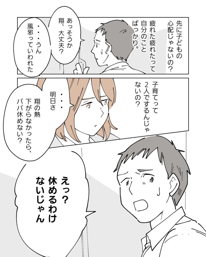 翔の発熱で私が早退したの。それって当たり前なの?それに自分のことより先に子どもの心配じゃないの?疲れたとかご飯とか、自分のことばかりの良平へのいら立ちが募りました。