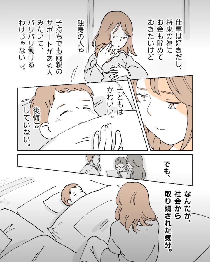今の仕事は好きですし、将来のためにお金も貯めておきたいので働けるうちは働いておきたいのが正直なところ。でも私の場合、独身の人や子持ちでも両親にしっかり頼れる人のように仕事だけに集中してバリバリ働けるわけではありません。良平と結婚し、こんなにもかわいい翔が産まれてきてくれたことに後悔はありません。それでも、なんだか自分だけが社会から取り残された気持ちになって気持ちが滅入ります。