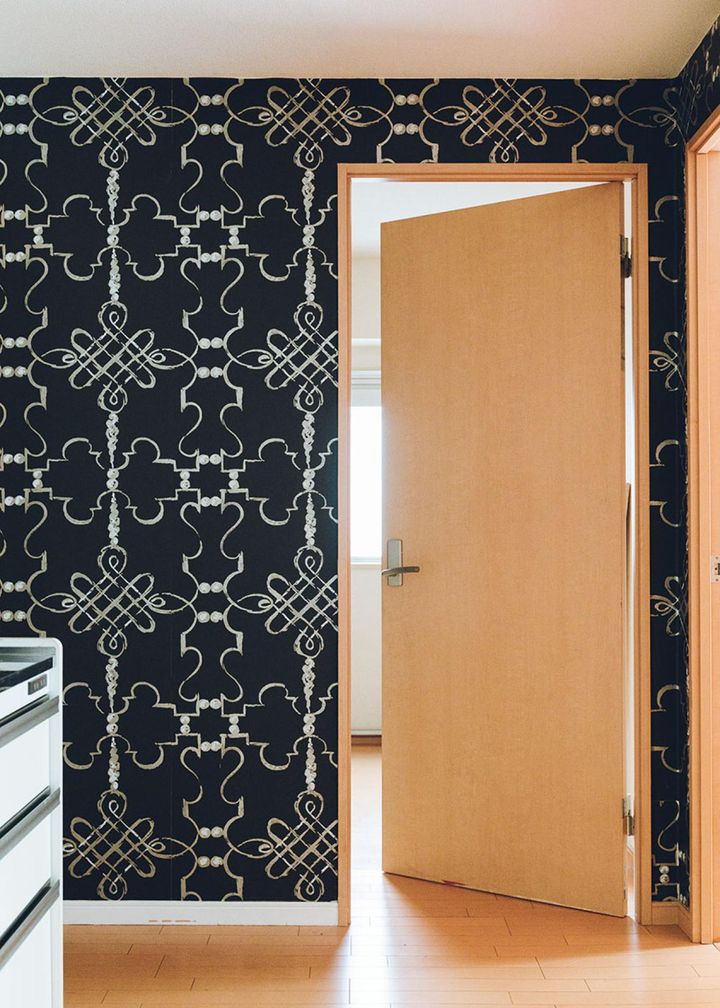 DIYで壁紙張りにも挑戦。大胆な柄の輸入壁紙は専門店の特売でゲット。