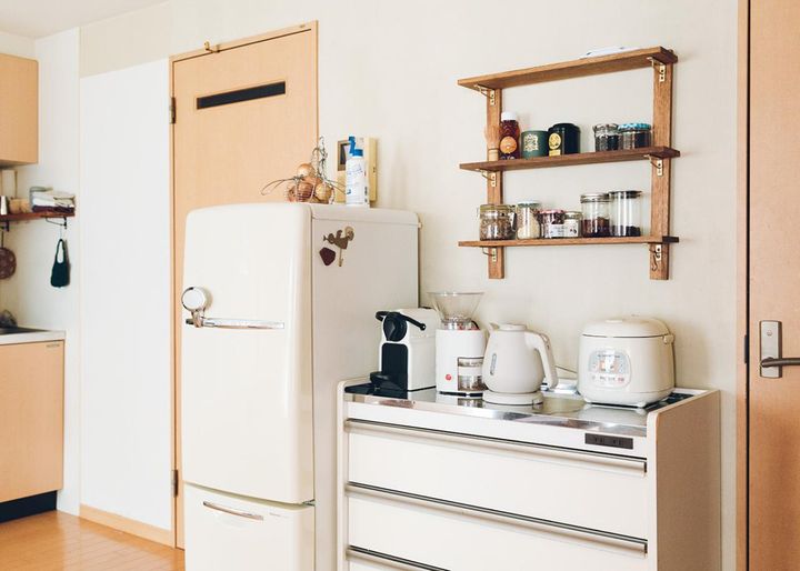 レトロデザインの冷蔵庫と引き出し収納は20年以上使っている。壁面の棚は、インスタグラムを参考にmihaさんがDIYで設置。100円ショップの金具を塗料で真ちゅう風に。