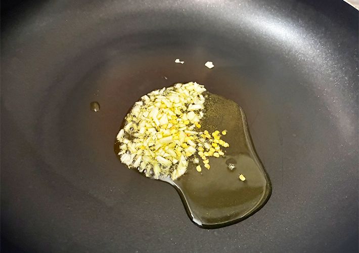 まず、フライパンにオリーブオイルを入れ、ニンニクとトウガラシの種を弱火で炒めてください。