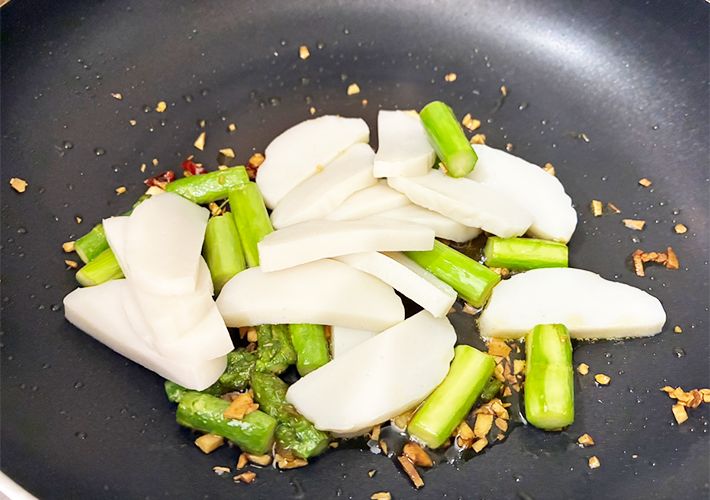 ニンニクがキツネ色になる一歩手前のところで、アスパラガスと細かくカットしたトウガラシを入れて炒めます。