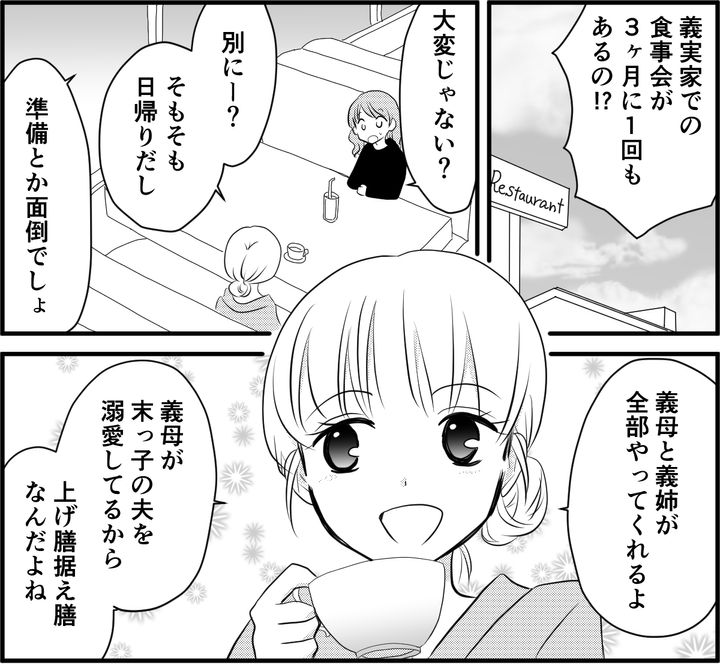 私としては、事前の準備は手伝わなくていいし、当日もお客様のように扱ってもらえるので負担なく義家族と付き合えています。義両親や義兄には上手いこと甘えればなんでも許されるのです。その様子に夫も満足そうにしているし、そんな夫を見た義母も嬉しそうだからいいでしょう。
