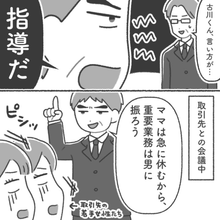 衝撃のエピソードを漫画化!今回は男性の育休取得や子育てとの両立をする女性に差別的な発言や行動をする上司のお話をご紹介します。