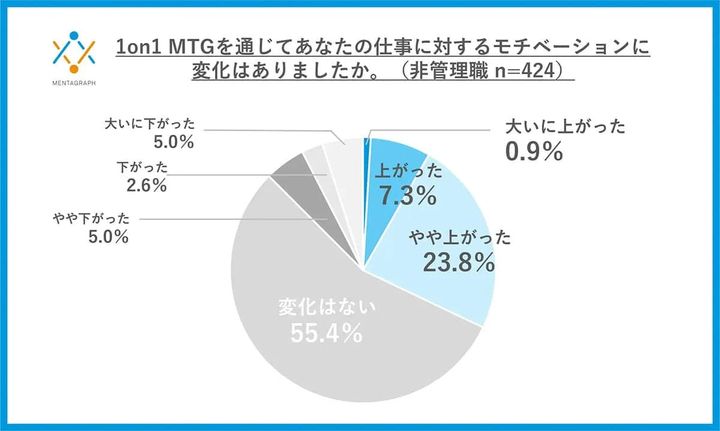 MENTAGRAPH株式会社による調査によると、1on1MTGの実態として「毎回似たような内容の繰り返しになっている」(51.9%)が最多となりました。非管理職の部下にモチベーションの変化を尋ねたところ、「上がった」と回答したのは約3割にとどまり、約7割が「変化はない」または逆に「下がった」と回答しています。