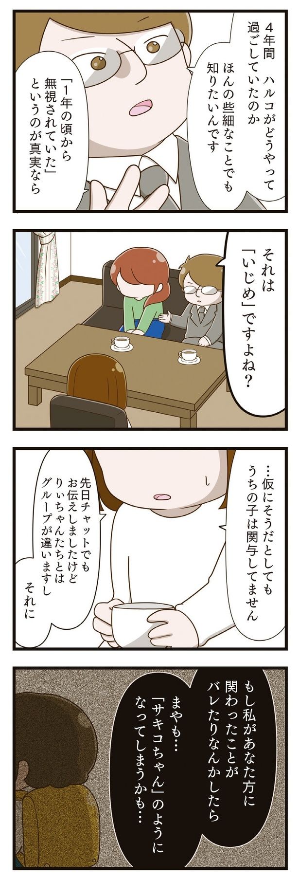 「お姉ちゃん学校でいじめられているんだって」息子の一言がきっかけで、母親は娘・ハルコの言動に違和感を抱くようになる。その結果分かったのは、ハルコが4年間、ひとりでいじめに耐えて隠し続けていたこと。いじめの本当の加害者は、被害者は誰? いじめと向き合う家族が希望を取り戻すまでの物語『家族全員でいじめと戦うということ。』を再連載でお届けします。いじめの原因になった同級生を描く新作『「お母さんの言うとおり」にしてきたのに 家族全員でいじめと戦うということ。 サキコの場合』も好評発売中です。
