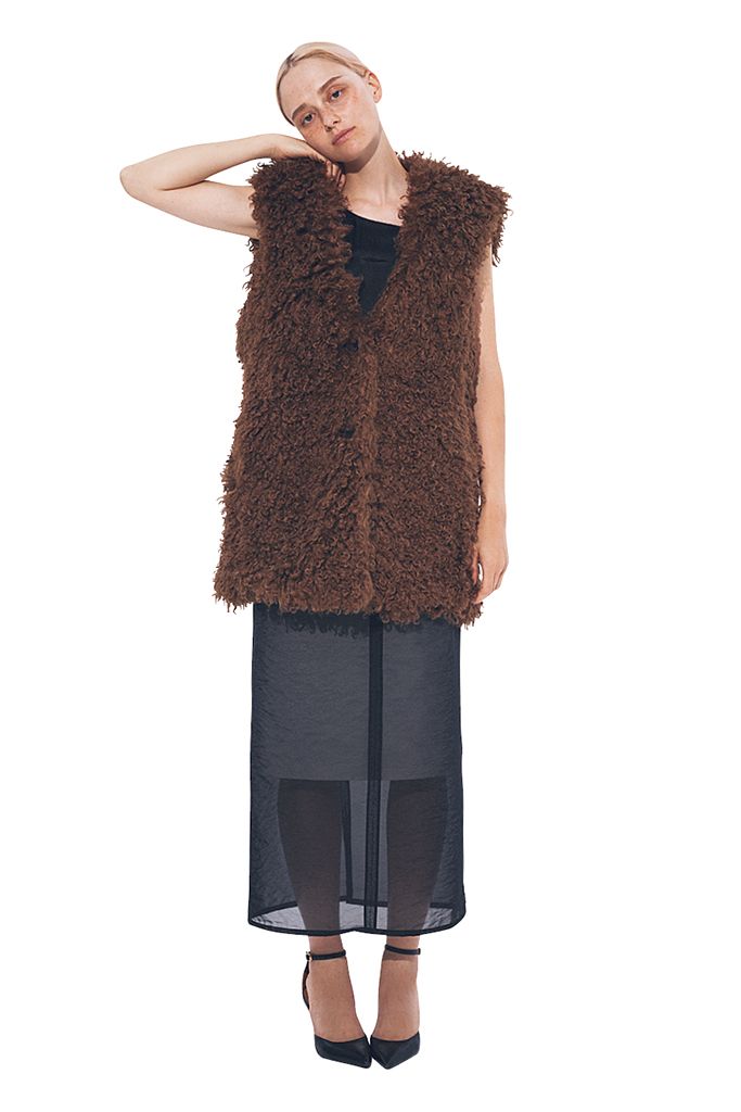 ボアベストは着まわし。黒サテンノースリトップス/MIESROHE(MIESROHE ルミネ新宿1店) 黒スカート/アルアバイル シューズ/CORCOVADO(フィルム)