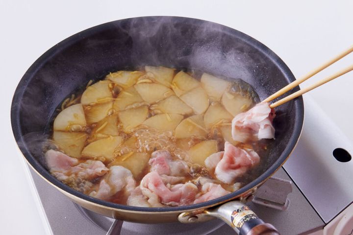 時間がない日でも、しみじみおいしい煮ものが食べたい。そんなときは、薄切り大根×豚しゃぶ肉の組み合わせが正解です。炒めてから煮るひと手間で、短時間でも味しみよく仕上がります。しょうがの香りと、わかめの食感がきいて、最後まで食べ飽きません!