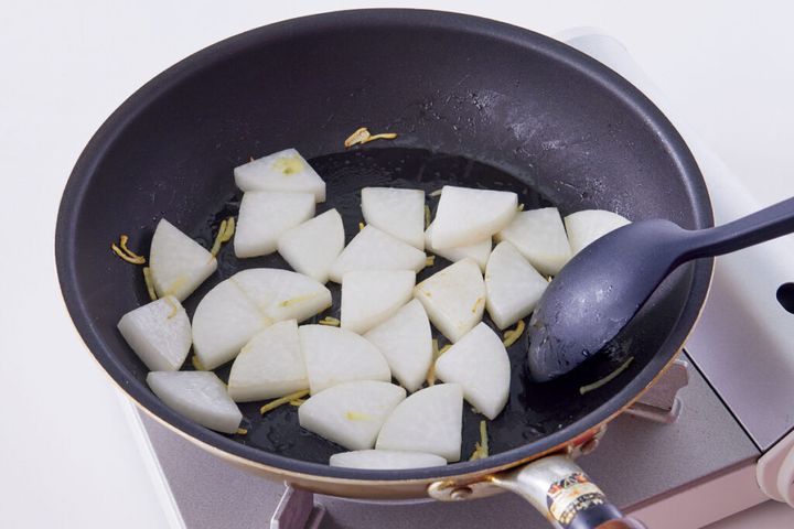 (2)フライパンにサラダ油を中火で熱し、しょうがを入れて炒める。香りが立ってきたら大根を加え、大根がかるく色づくまで2分ほど炒める。