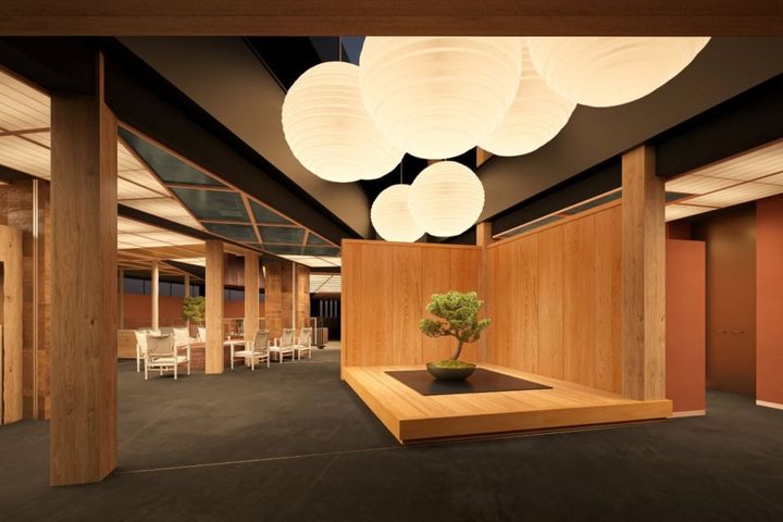 和の美意識を現代的に昇華させ、自然素材の木や石などを随所に用い、職人の技が息づく空間。エントランスを進むと、厳島神社の能舞台を着想源としたギャラリースペースや広島県で作られた提灯の照明がやわらかな光がお出迎え。地域の文化と日本の美を感じられる優雅な空間がとっても素敵。