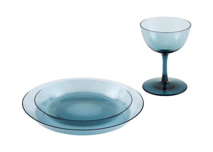 〈木村硝子店〉の再生硝子シリーズに、シンプルなプレートとマティーニグラスが新たにラインナップ。細かな気泡やブルーグレーの色の濃淡、微妙な個体差など、特有の表情を持つ姿に魅了される。ひとつひとつハンドメイドにより吹き上げられたグラスは、限りなく薄い繊細さで口当たりもいい。