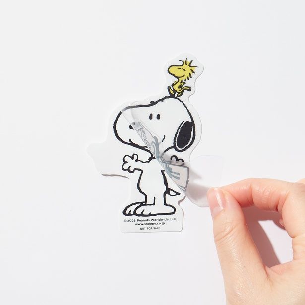 「PEANUTS WARDROBE」シリーズを3300円以上購入すると、「オリジナルきせかえ2層ステッカー」(非売品)が1枚もらえる。この特典は、スヌーピーが描かれたダイカットのステッカーに、タブリエとティーセットが描かれた透明のステッカーを重ねた“きせかえ”風の遊び心あるアイテム。公式オンラインストアでの買い物も対象だ。