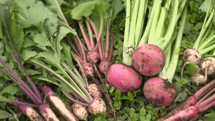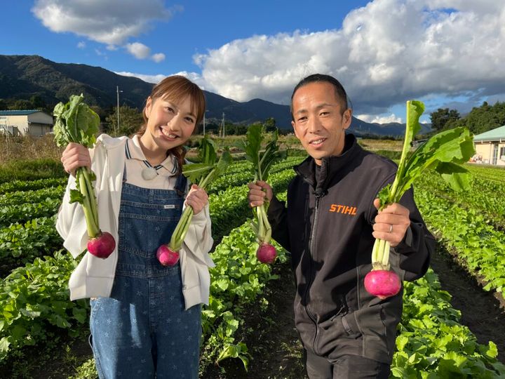 はいださんは、滋賀・高島市で赤カブをはじめたくさんの野菜を作っている「みなくちファーム」へ。一面に広がる畑を見て「全部カブですか?」と驚くはいださん。頷いた農家の水口さんは、ここで7種類のカブを育てている。「中でもオススメは、高島のご当地カブの『万木(ゆるぎ)かぶ』です」と水口さん。万木かぶは高島市の万木地区原産で、風味の強い赤カブ。「漬物にしても味がボケない、カブ本来の味がする」品種だという。農薬や化学肥料を使用せず自然に近い育て方で本来の味を引き出している。