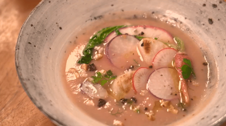 元うたのおねえさん・はいだしょうこさんが訪れたのは、滋賀県高島市。美しいメタセコイヤ並木を抜けて着いたのは、高島市の旬の食材を楽しめるレストラン・禾果漂馨(かかふか)。料理人のハタノさんが、赤カブと酒粕を使ったスープをサーブしてくれた。