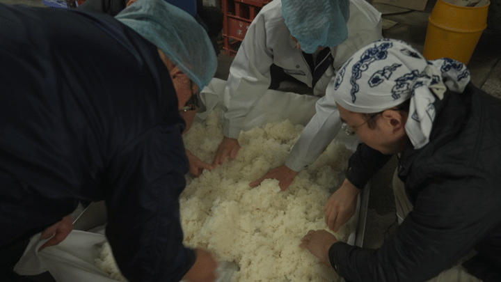 はいださんが「すごくクリーミー!」と堪能した赤カブと酒粕のスープ。この一皿に使われた酒粕は、地元の酒蔵で作られている。吉田酒造を訪れたはいださんは「もとだて」という、蒸した米を発酵してお酒のもとを造る作業を見学する。