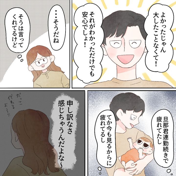 夫は「良かったじゃん、大したことなくて」と言ってくれたけれど、連勤で疲れている夫にわざわざ娘を預けて歯医者に行ったことを申し訳なく感じてしまうのでした。