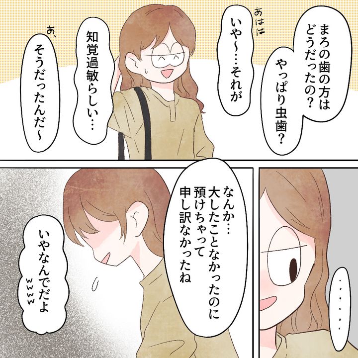 じつは知覚過敏ではないのに、この診断に安心したまろは痛みを放置するようになるのでした……。