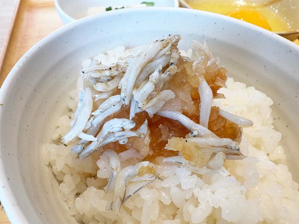 しらすおろしにしょうゆを加えて、ご飯の上にのせて食べれば、しらすのうまみと大根のみずみずしさがご飯にぴったり。海苔をまいて食べてもいい味わいでした。それだけでご飯を完食。
