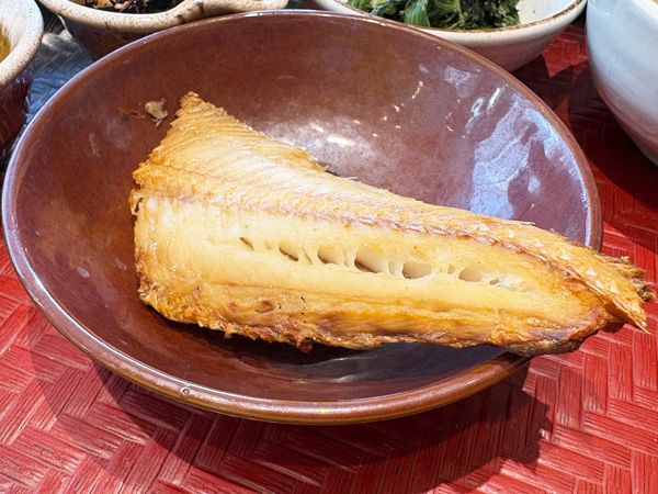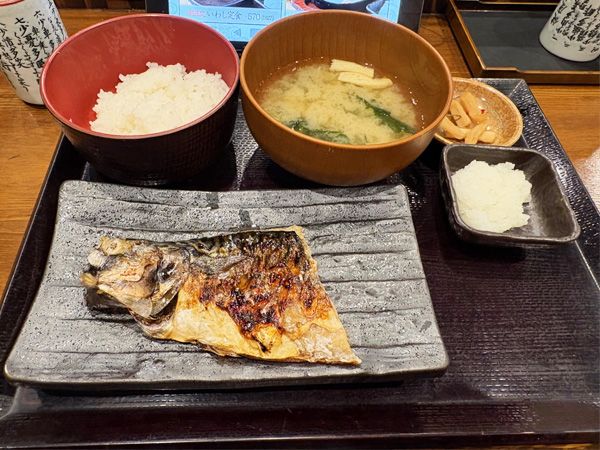 選んだのは「朝さば文化干し定食」。炭火焼きでじっくり焼きあがったさば文化干しは、半身の半分のサイズ。表面はパリッパリに香ばしく焼きあがっています。出てきたのは尾頭付きの部分だったのですが、まるごと食べられるほどの香ばしさでした。中身はふっくら。サバのうまみがギュッとつまった味わいでした。