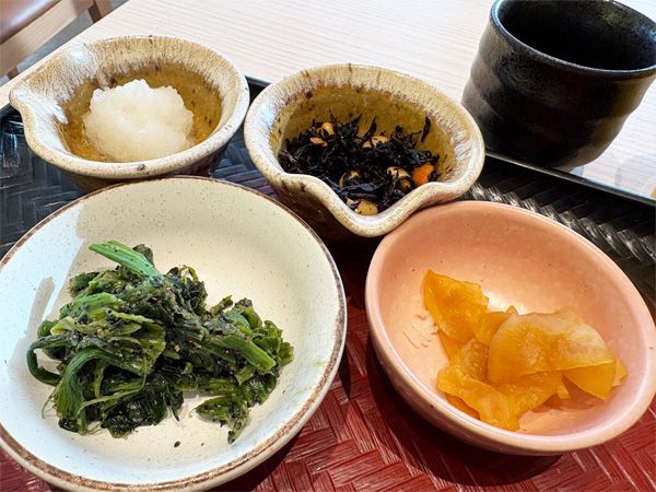 小鉢は、ホウレンソウのお浸し、ひじき、つけもの。そして、ほっけ炭火焼き用の大根おろし。ほっけがそのままでも十分うま味が出ていたので、大根おろしは小鉢の1つとしてご飯とともに食べることに。いろいろなおかずがそろっているのが、定食の魅力です。