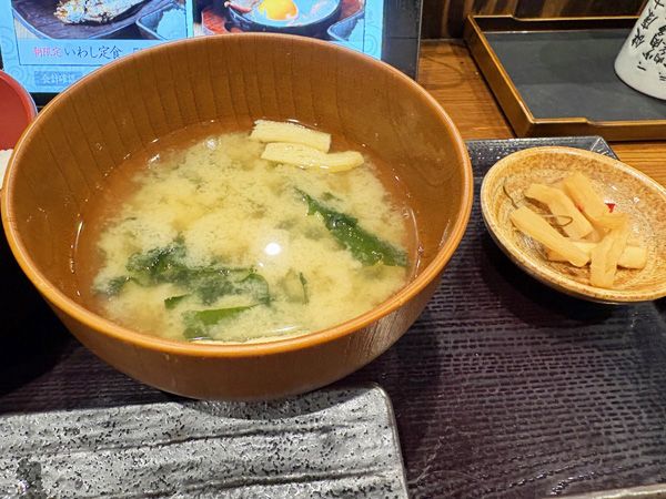 みそ汁は大きな器でたっぷり。ワカメと油揚げがいい塩梅でした。大根おろしは、もちろんご飯と一緒に。ご飯は普通盛りの半分ほどの「半割」を選んだのですが、ご飯がもっと食べたくなるような朝ごはんでした。
