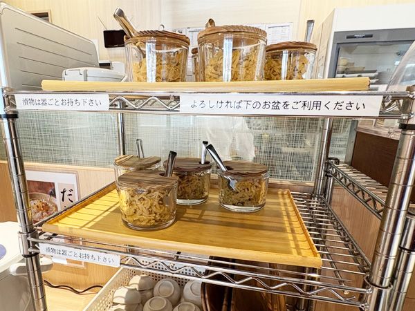 実はこちらのセルフコーナーには、「だし」も用意されています。今回はお腹が満足してしまったのですが、次は漬物にだしをかけて食べてみたいです。