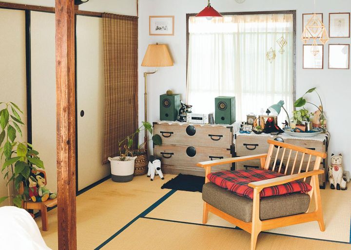 4.5畳の寝室には、夫が使っていたひとりがけソファやリサイクルショップで見つけた和箪笥を置いて。隣の3畳の和室は丸ごとクローゼットに。