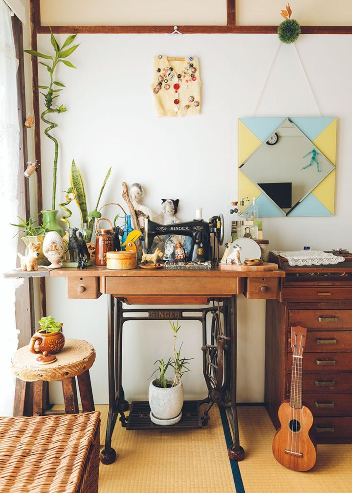 窓辺の足踏みミシンは母から、小引き出しは父から受け継いだもの。
