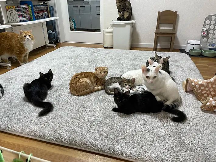 10匹近くの猫たちが、まるで新年会をしているかのごとく、絨毯の上に密集していました!