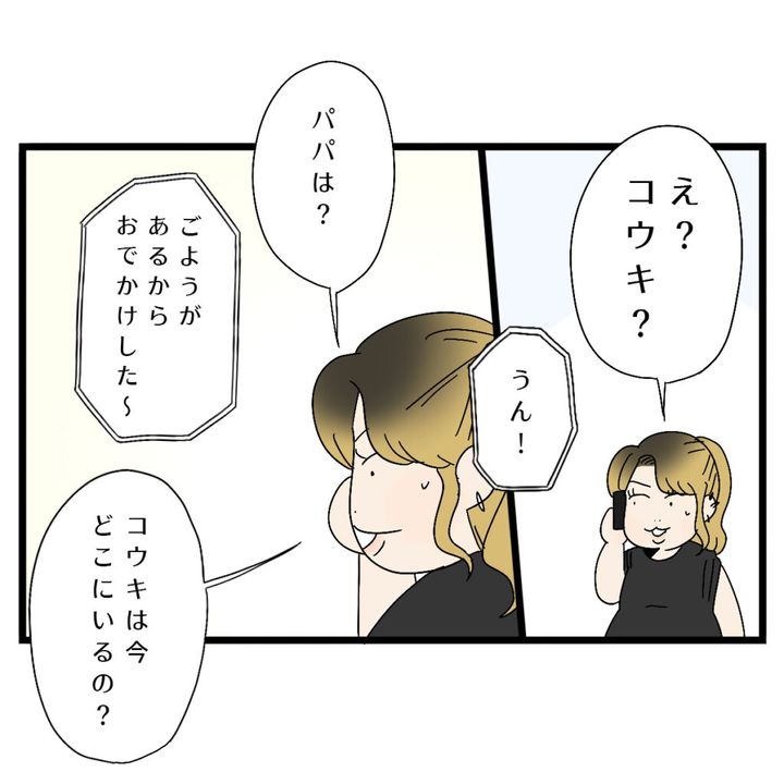 信也さんと一緒にいないコウキくんが信也さんの電話に出てきたことに驚き状況が飲み込めないサチさん。コウキくんに聞くと、信也さんは用事があると言って、電話を置いたまま出かけてしまったようです。コウキくんがひとりにされている状況に、ますます心配になったサチさんはコウキくんはどこにいるのか聞きました。