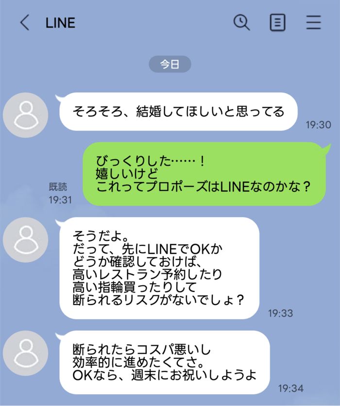 でも、一生に一度のプロポーズが、たった一行のLINEで済まされてしまうの?というモヤモヤも同時に生まれました。