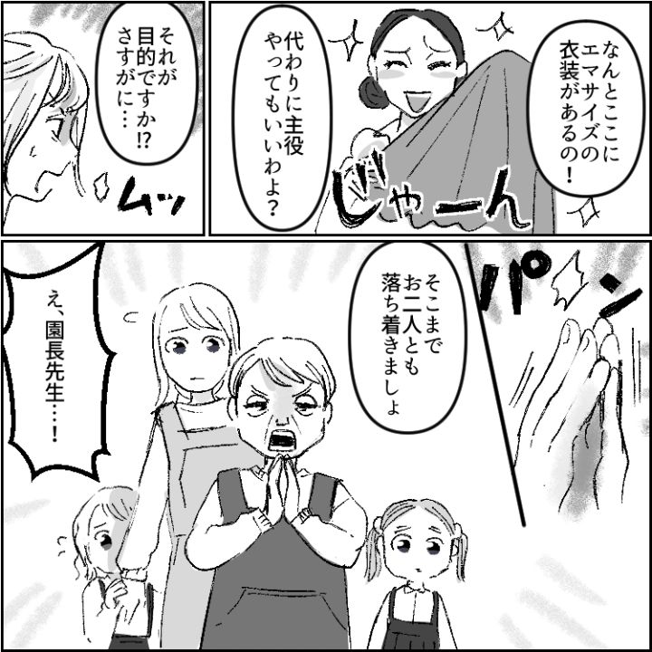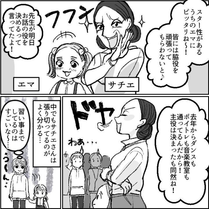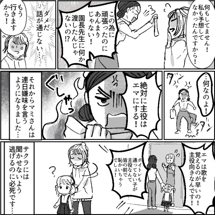 マミの娘・サクラが通う幼稚園では、園長先生の方針で、全員参加の演劇を毎年年長クラスで実施することになっている。ママ友のサチエさんはステージママ気質で、娘のエマちゃんを主役にするためにかなり力を入れているらしい。どうやらダンスにボイストレーニングに音楽教室と、習い事を掛け持ちさせてかなり気合いを入れているようだ。