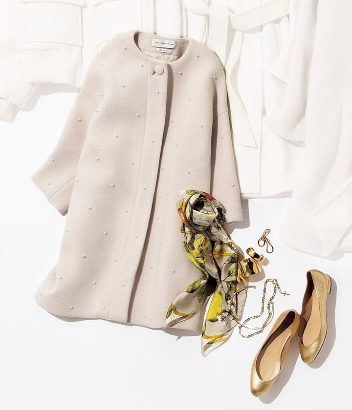パール付きコート¥110,000(ツル バイ マリコ オイカワ)パンプス¥100,100(フランチェスコ ルッソ/ロンハーマン)ネックレス¥110,000(ヴィール/エストネーション)チョーカー¥7,480〈ピルグリム〉バングル太¥61,600バングル細¥39,160〈ともにソコ〉(すべてズットホリック)イヤリング¥46,200(ブランイリス/ブランイリス トーキョー)スカーフ¥22,000(マニプリ)