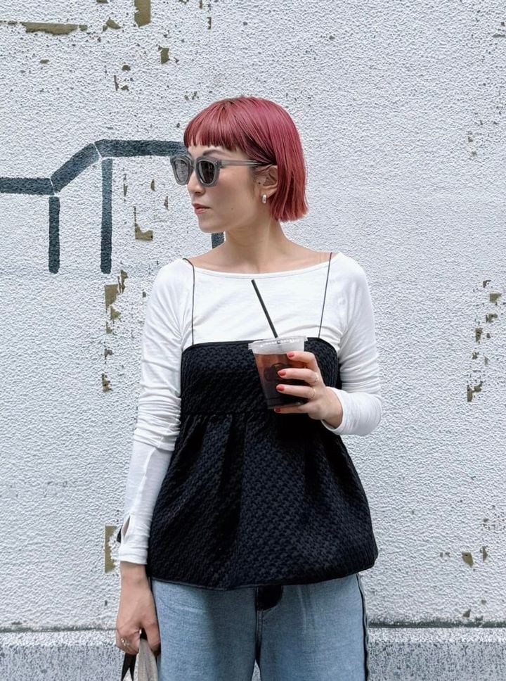 「ひとつひとつのアイテムにデザイン性があるので、色味はシンプルに。Cecilie Bahnsenのビスチェは生地の雰囲気とシルエットが可愛くてお気に入り。カットソー×デニムの組み合わせに個性をプラスできます。デニムも、“裏返し“デザインなので、他と差のつくコーデが手軽に完成します!」(ヘアサロンPARKオーナー 水戸怜子さん)