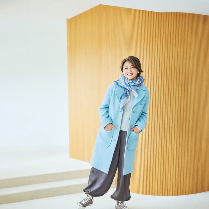 「服はあまり買わないし、トレンドも気にしないのですが、買うときはこれいいかも!と直感で選ぶことが多いです」という香坂みゆきさん。この日着用の水色のコートも赤いスカートも直感で選んだお気に入り。「年を重ねるにつれ、自分がくすんでくるから(笑)、明るい色を取り入れるようになりました。特に冬は着こなし全体が暗くなりがちなので、色がいいアクセントになってくれます」。