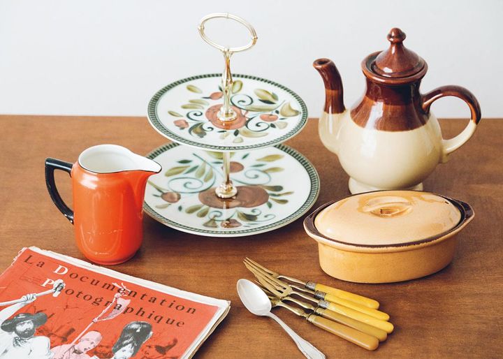 パリのカフェで働いている長女宅に滞在して、パリやベルギーなどの蚤の市を回るのがmihaさんの楽しみ。「赤いジャグは1920年代の旧チェコスロバキア製。別々の蚤の市でセットの器を見つけたり、雑多な中から宝物を探すのが楽しくて」。食器は気分に合わせて日常使いしている。