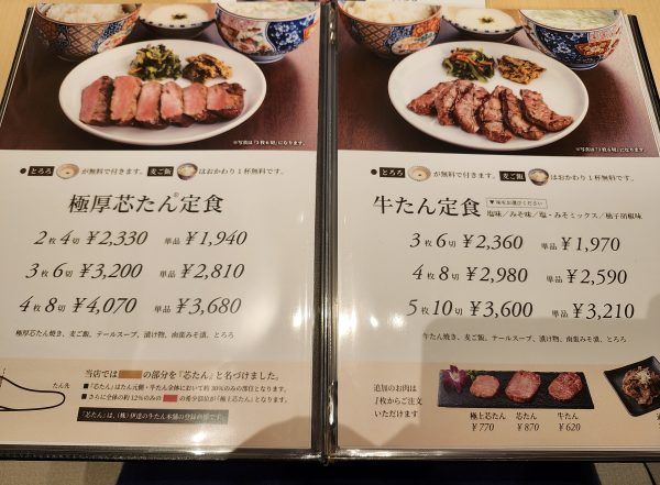 他には「極厚芯たん定食」や定番の「牛たん定食」など、ご褒美にいただきたいメニューも豊富です。